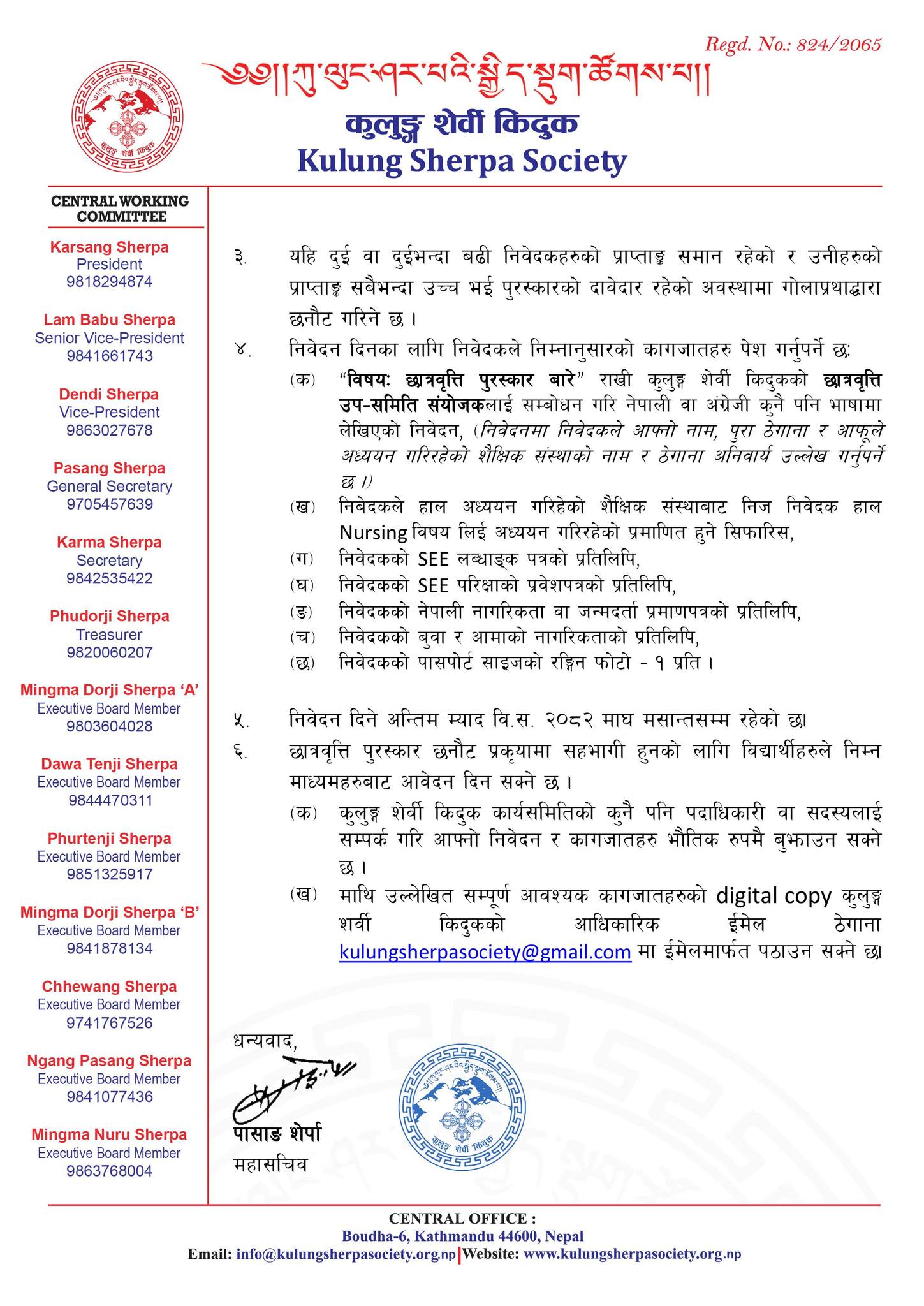 आवेदन किदुक कार्यसमितिका कुनै पनि पदाधिकारी वा सदस्यलाई भौतिक रूपमा बुझाउन सकिनेछ । साथै, सम्पूर्ण आवश्यक कागजातहरूको डिजिटल प्रतिलिपि किदुकको आधिकारिक इमेल kulungsherpasociety@gmail.com मा पठाएर पनि आवेदन दिन सकिने व्यवस्था गरिएको छ ।