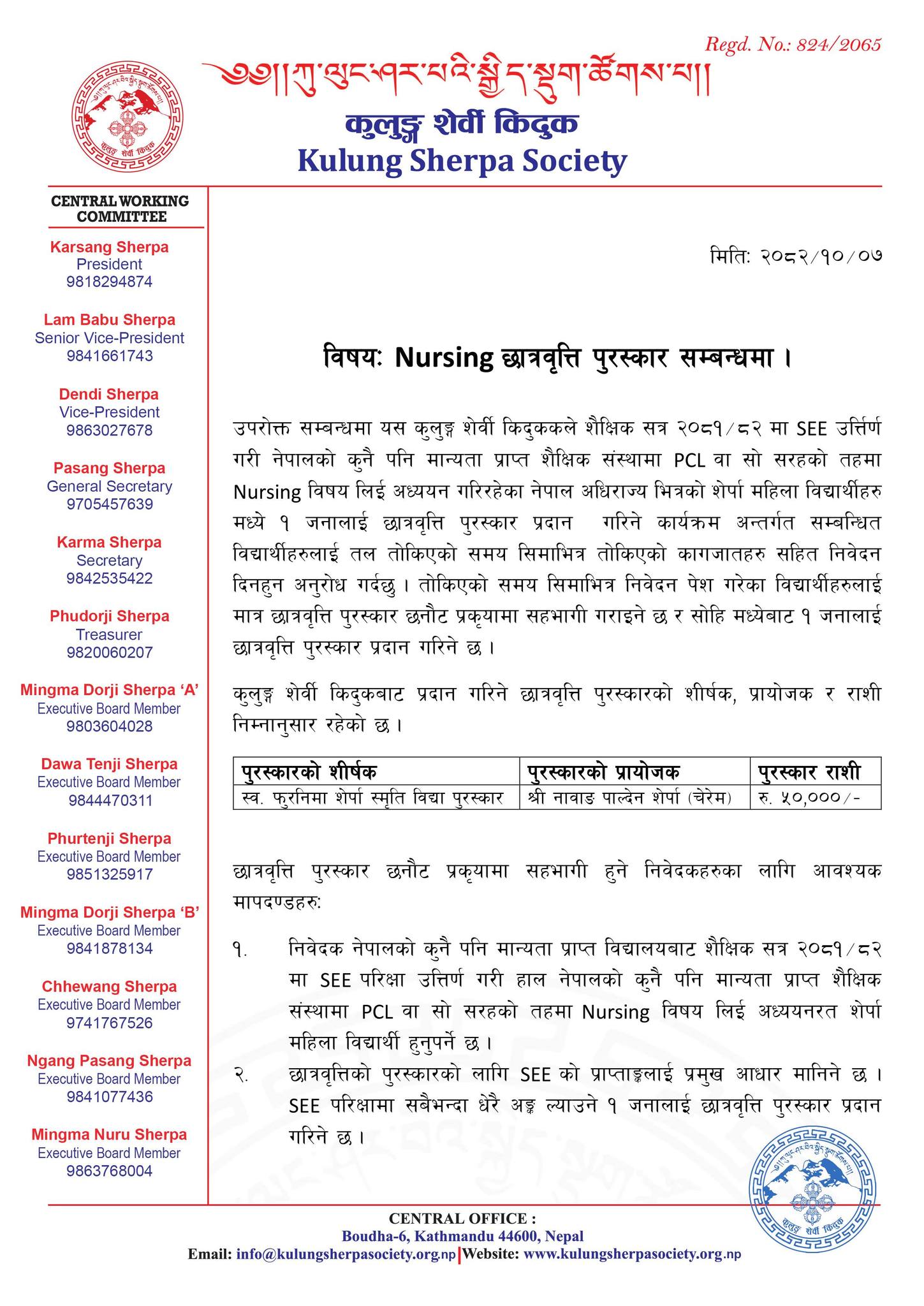 उक्त पुरस्कारका प्रायोजक नावाड पाल्देन शेर्पा (चेरेम) रहनु भएको छ भने पुरस्कार राशि रु. ५०,००० रहेको छ । छात्रवृत्तिका लागि आवेदन दिने विद्यार्थीले शैक्षिक सत्र २०८१-८२ मा SEE परीक्षा उत्तीर्ण गरी हाल नर्सिङ विषय अध्ययनरत हुनुपर्नेछ ।